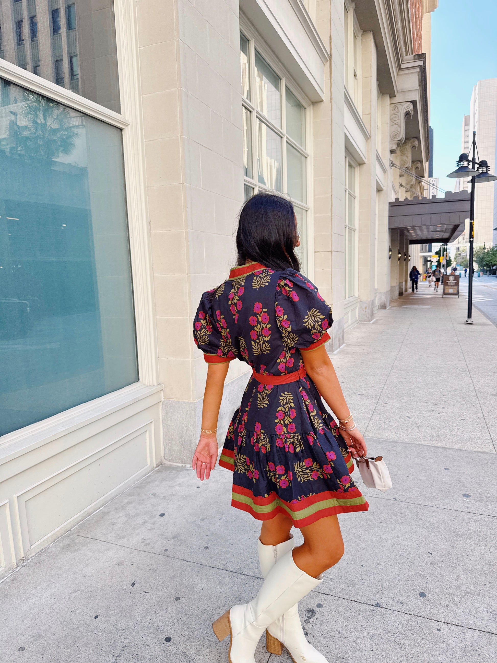 Our Falling in Love Dress is the designed in a timeless black floral print, it features a flattering v-neckline with contrast trim and a lined silhouette for effortless wear. Front buttons and a tie waist add feminine charm, while short puff sleeves and hidden side pockets bring a touch of playful practicality. Crafted from a no-stretch woven fabric, it offers a structured yet comfortable fit—made to flatter every occasion.